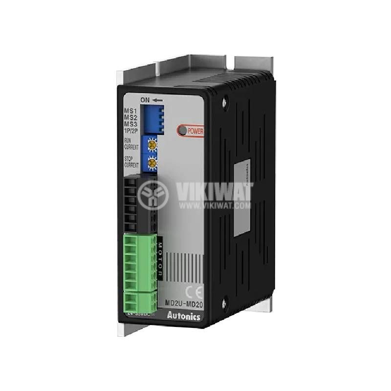 The MD2U-MD20 two-phase stepper motor driver enables extremely precise motor control with low mechanical noise and low vibration. The isolated optocoupler input minimizes the influence of electrical noise. It has a supply voltage of 24-35 VDC and a maximum current consumption of 3 A.