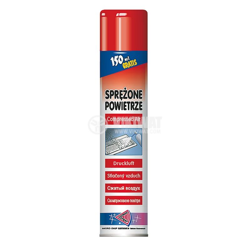 Cleaning spray for keyboards, computer components, electronic parts, optics, office supplies and others using compressed air. Supplied with extension tube.