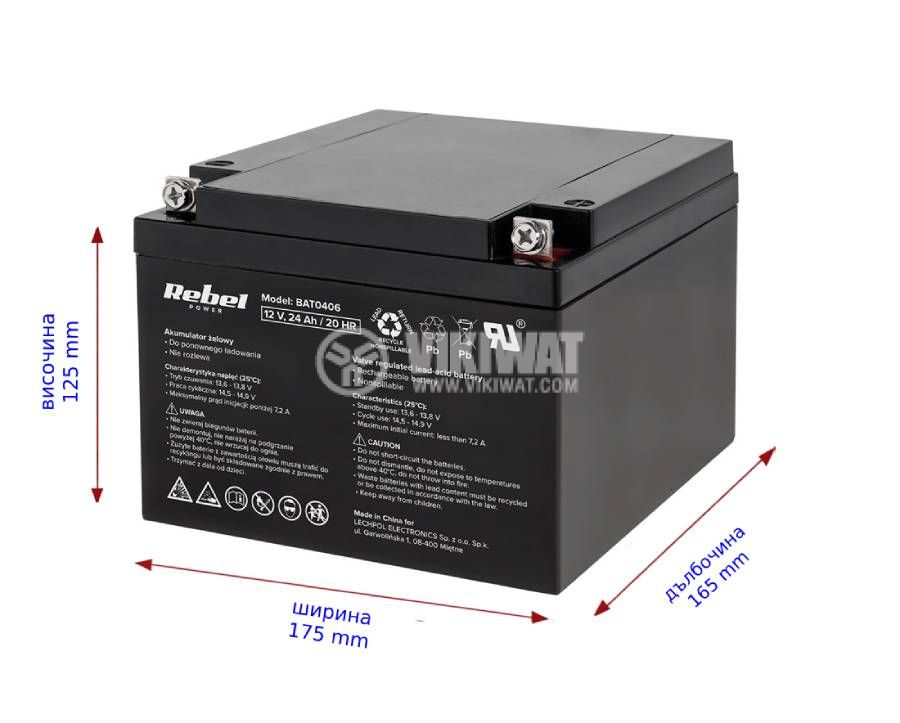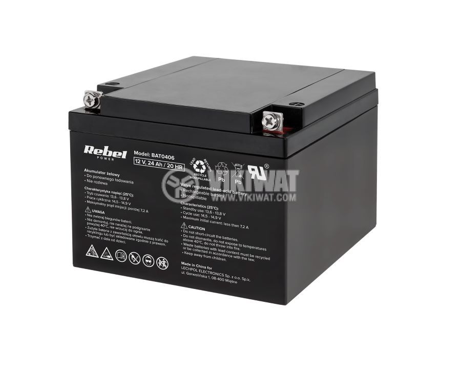 UPS акумулатор BAT0406 оловно-киселинен, необслужваем, VLRA, на 12 V / 24 Ah. Подходящ за UPS захранвания, с дълъг живот. Размери - 175x165x125 mm. Презареждаема, капсулована акумулаторна батерия.