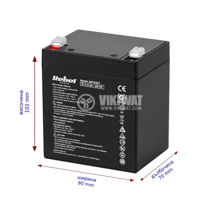 UPS акумулатор BAT0407 оловно-киселинен, необслужваем от Rebel, на 12 V / 5 Ah. Юпиес акумулатор, подходящ за UPS захранвания, с дълъг живот. Размери - 102x90x70 mm. Презареждаема, капсулована акумулаторна батерия.