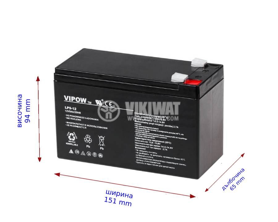UPS акумулатор BAT0228 оловно-киселинен, необслужваем, VIPOW, на 12 V / 9 Ah. Тягов акумулатор подходящ за юпиес захранвания, с дълъг живот. Размери - 151x94x65 mm. Презареждаема, капсулована акумулаторна батерия.