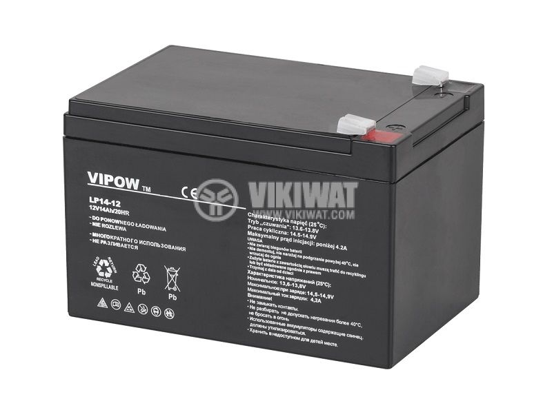 Гелов тягов акумулатор BAT0217 от VIPOW, с дълбок разряд, специално създаден за съхраняване на енергия, напрежение 12 V и повишен капацитет от 14 Ah. Подходящ за UPS захранвания, с дълъг живот. Габаритни размери 151x98x95 mm.