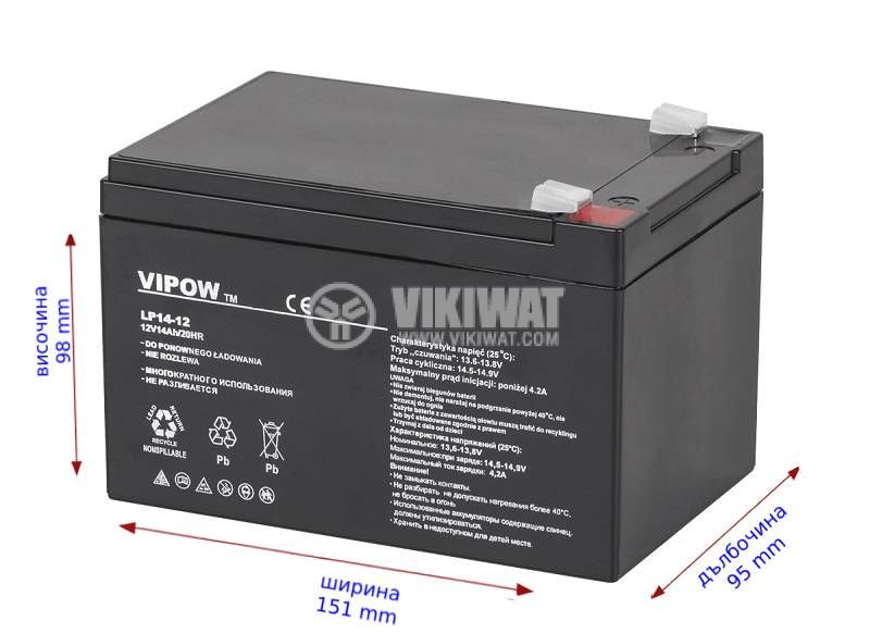 Гелов тягов акумулатор BAT0217 от VIPOW, с дълбок разряд, специално създаден за съхранение на енергия, напрежение 12 V и повишен капацитет от 14 Ah (размерите на корпуса е като на 12V, 12Ah). Подходящ за UPS захранвания, с дълъг живот. Габаритни размери 151x98x95 mm.