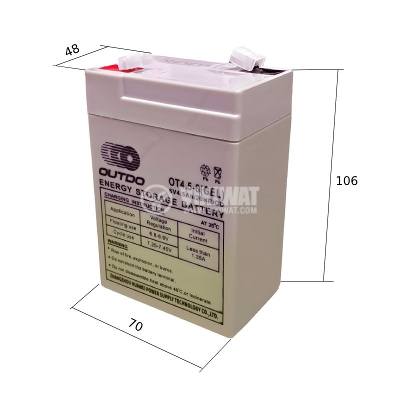 Геловия тягов акумулатор OT4.5-6(GEL)/CD от OUTDO намира приложение за UPS, резервно захранване, аварийно осветление, индустрията, охранителната техника, медицината, корабоплаването, военната електроника, телекомуникациите за преносима енергонезависима електроника, соларни инсталации и много други.