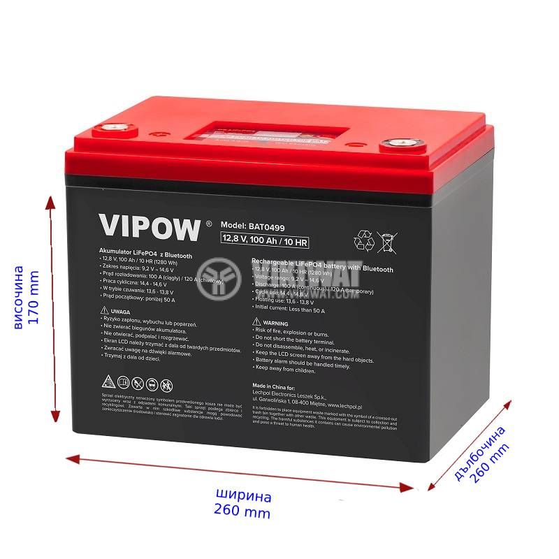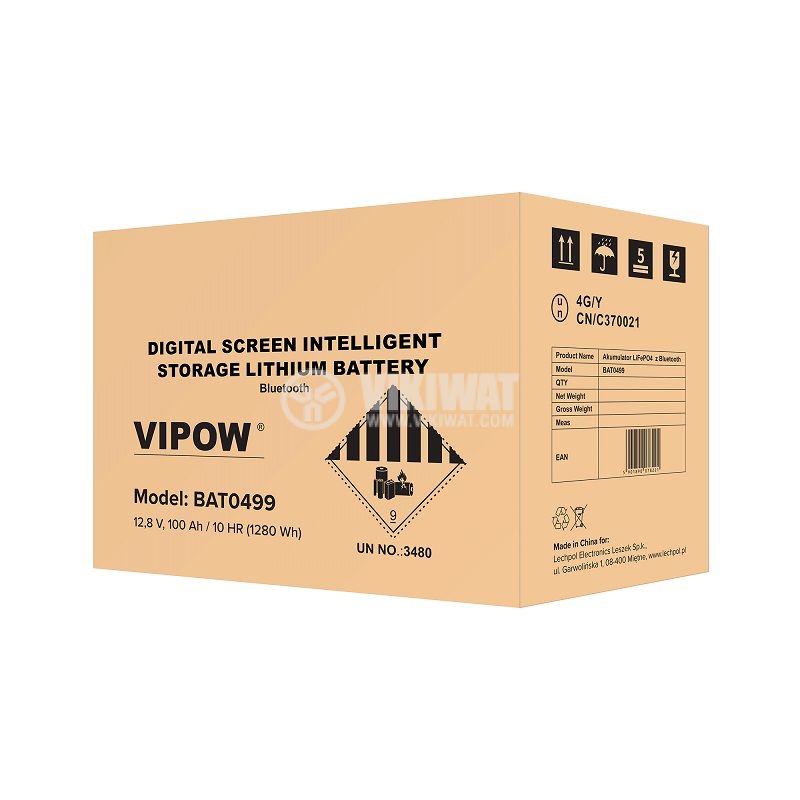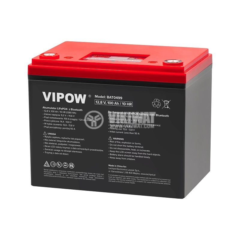 Тягов LiFePO4 (литиево-железен фосфатен) акумулатор BAT0499 от VIPOW, разполага с дисплей, вграден BMS и Bluetooth свързаност, специално създаден за съхраняване на енергия, напрежение и капацитет 12.8 V / 100 Ah. Дълъг живот - над 1500 цикъла на зареждане / разреждане и до 2000 при правилна употреба. Разме...