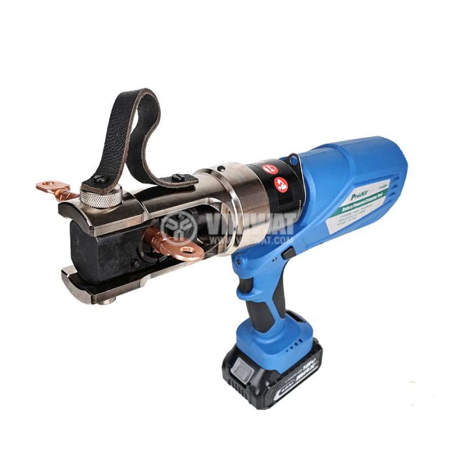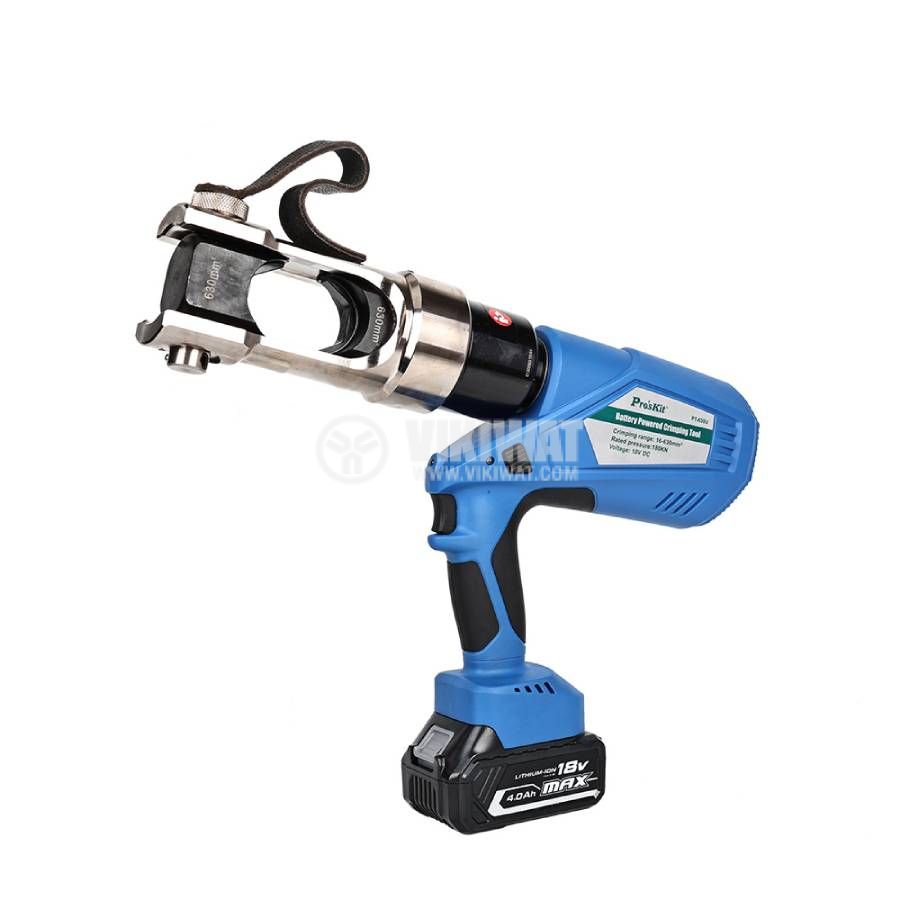 Акумулаторни клещи за кербоване на кабелни накрайници PT-630U от PRO'S KIT, сила на притискане 180kN, предназначени за кабели със сечение 16~630 mm², със сменяеми челюсти (13 различни броя в комплекта), работещи с батерия 4 Ah (включена в комплекта).