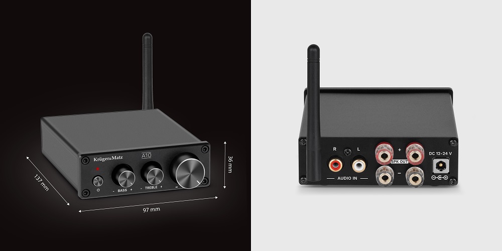 Интересувате се от мини усилвател за озвучителни тела? Kruger&Matz A10 съчетава голяма мощност и елегантност в минималистичен дизайн. Естетичният му външен вид го прави идеално решение за различни интериори, добавяйки фин щрих на модерност и компактност.