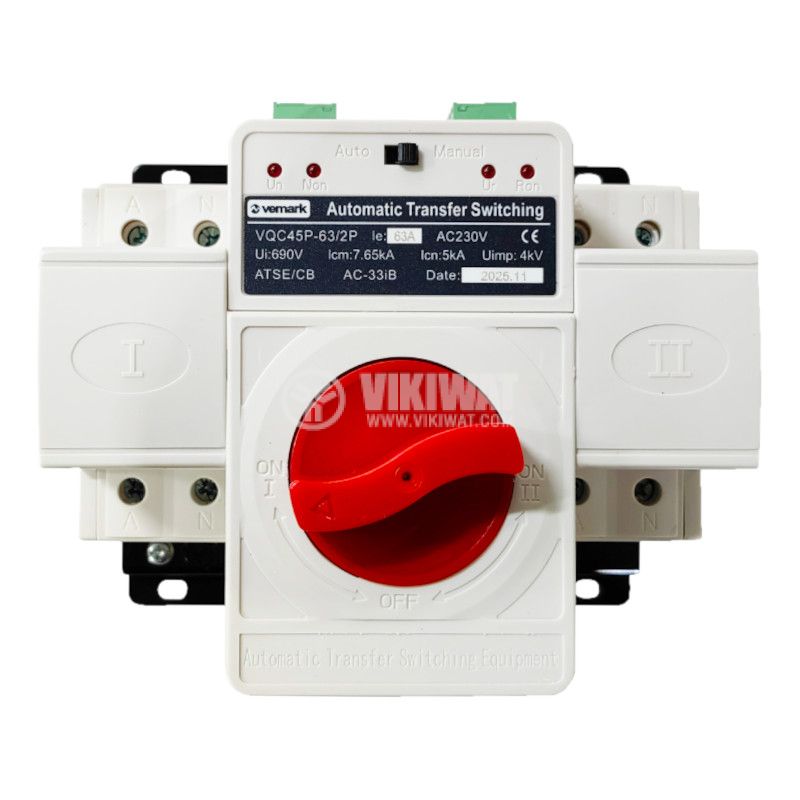 Трипозиционен ( I - OFF - II ) разединителен прекъсвач AQC45P-63/2P от VEMARK с ръкохватка. Номинален ток 63 A, работно напрежение до 400 V. За външен монтаж.