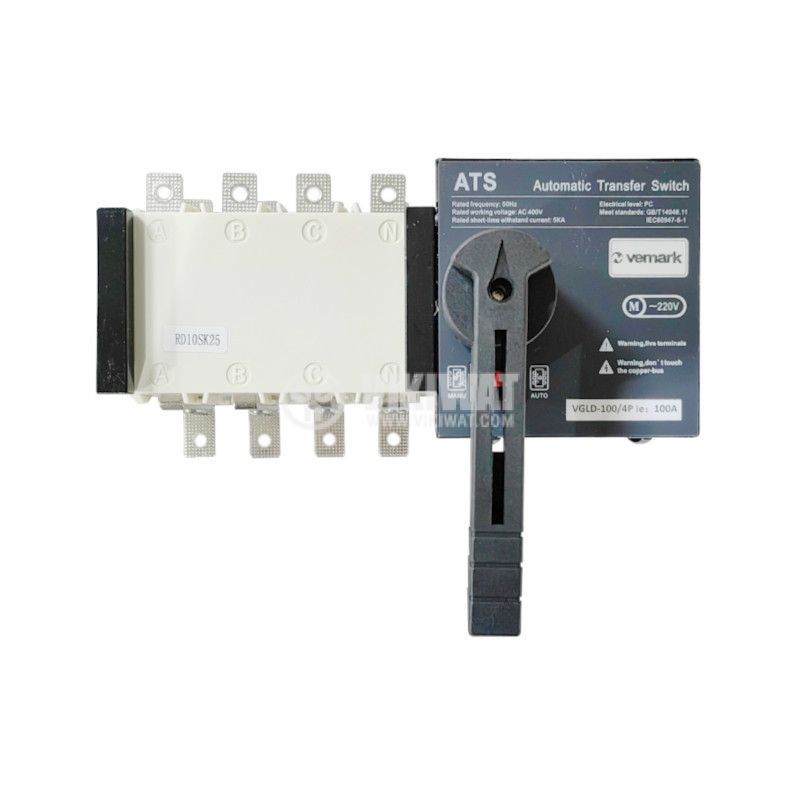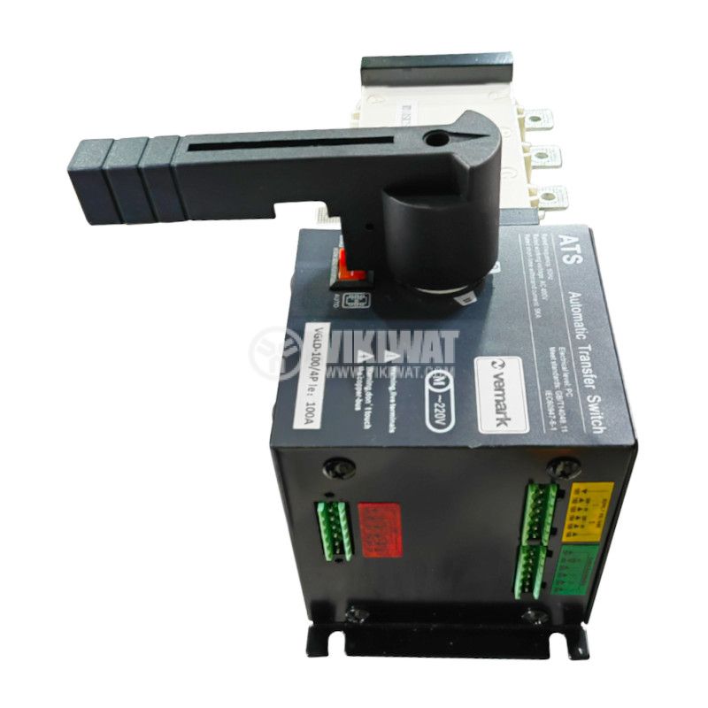 Трипозиционен ( I - 0 - II ) разединителен прекъсвач SGLD-100/4 от VEMARK с ръкохватка. Номинален ток 100 A, работно напрежение до 400 V. За външен монтаж.