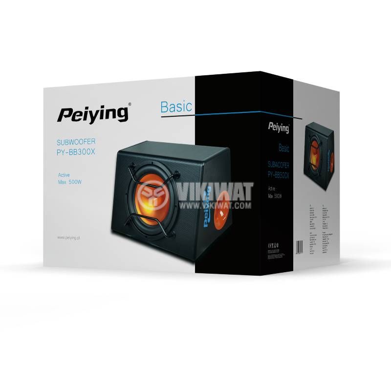 Активен, автомобилен субуфер (баскаса) PYBB300X от Peiying, с диаметър на говорителя 12 инча, максимална мощност 500 W (номинална 170 W), импеданс 4 Ohm и захранване 12 VDC.