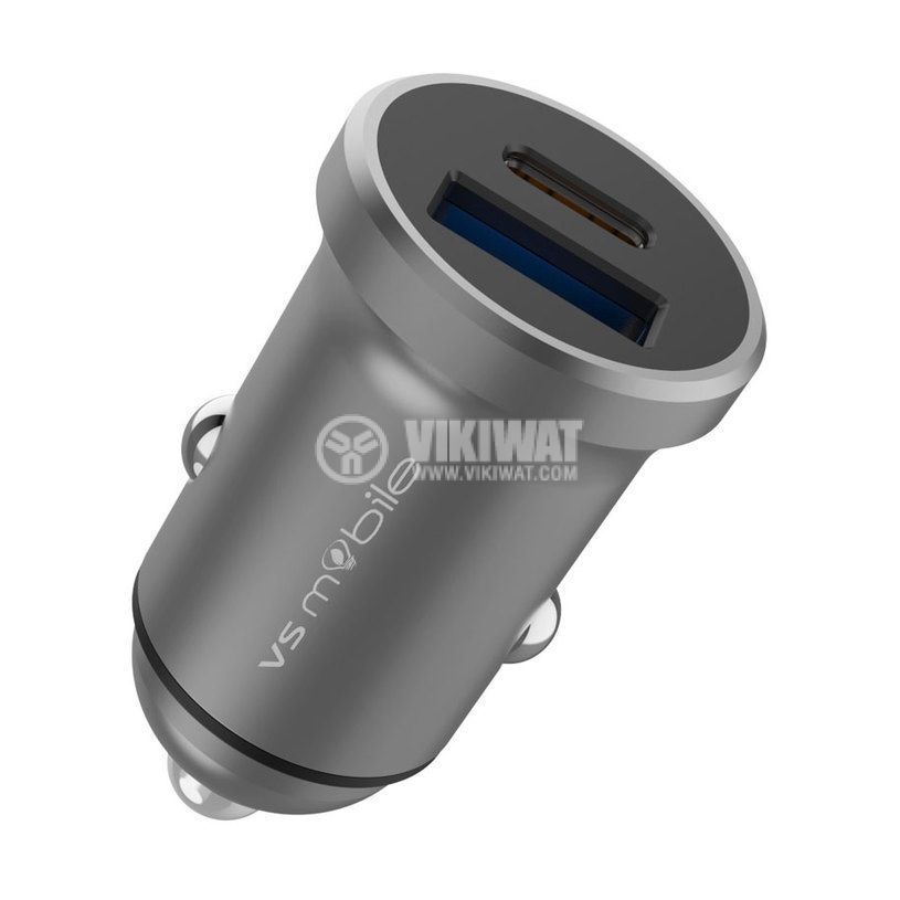 Автомобилно зарядно с USB и USB Type-C портове и USB Type-C kабел за телефон с черен цвят за зареждане на устройства като телефони, смартфони, таблети, слушалки, тонколони и много други.