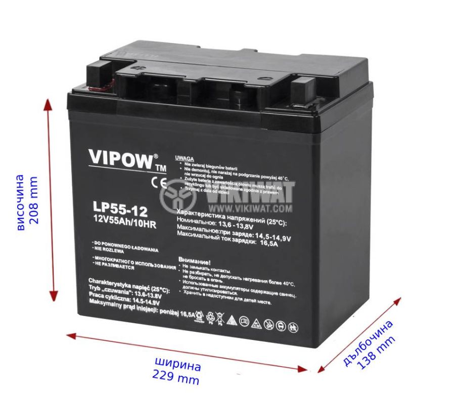 Gel traction battery LP55-12 from VIPOW, deep discharge, specially designed for energy storage, voltage and capacity 12 V / 55 Ah. Suitable for wheelchairs, long life. Overall dimensions 229x138x208 mm.