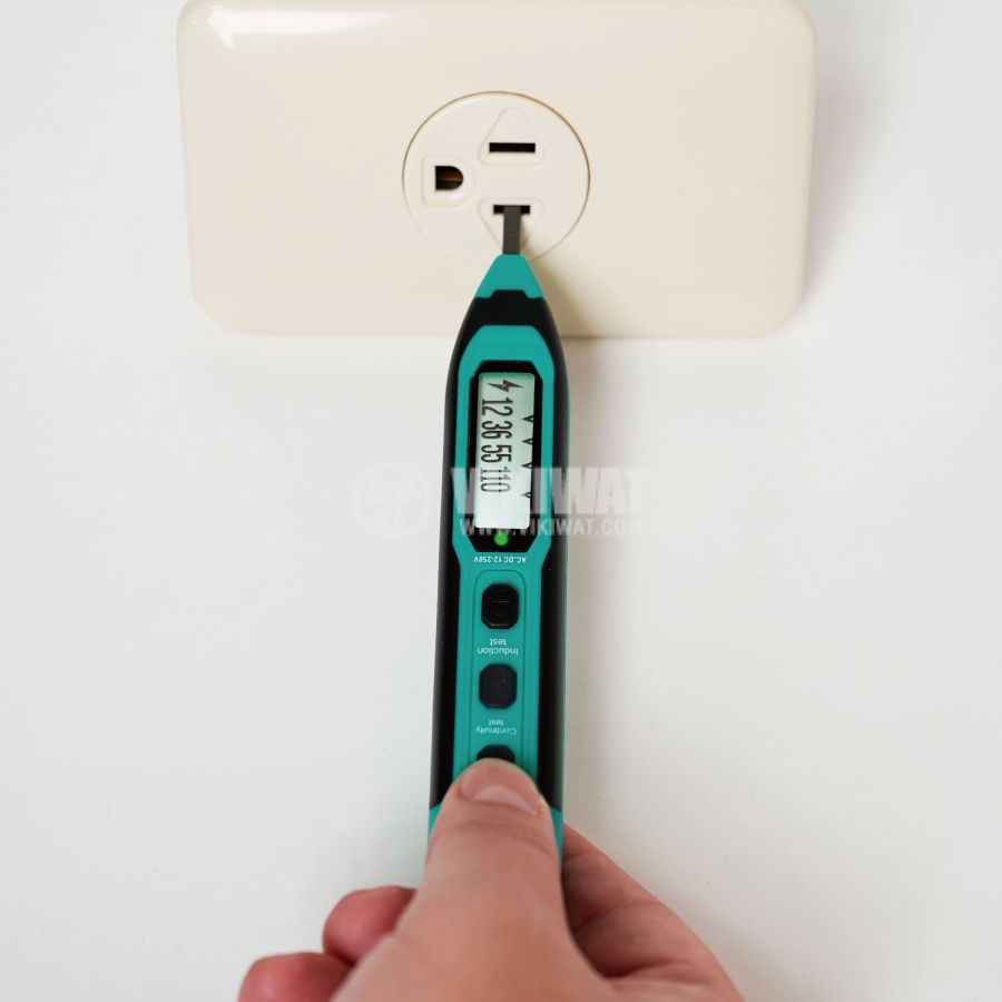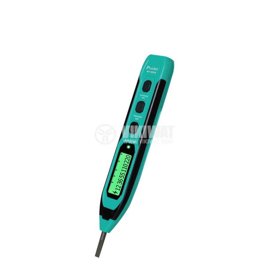 Безконтактен детектор на напрежение, дистанционен фазомер, NT-305N от PRO'S KIT, с LED дисплей, предназначен за замерване на напрежението в електрически системи, проверка на прекъснати кабели. Измерва 12, 36, 55 VDC или 70, 110, 250 VAC. Захранване от 4x LR41 батерии.