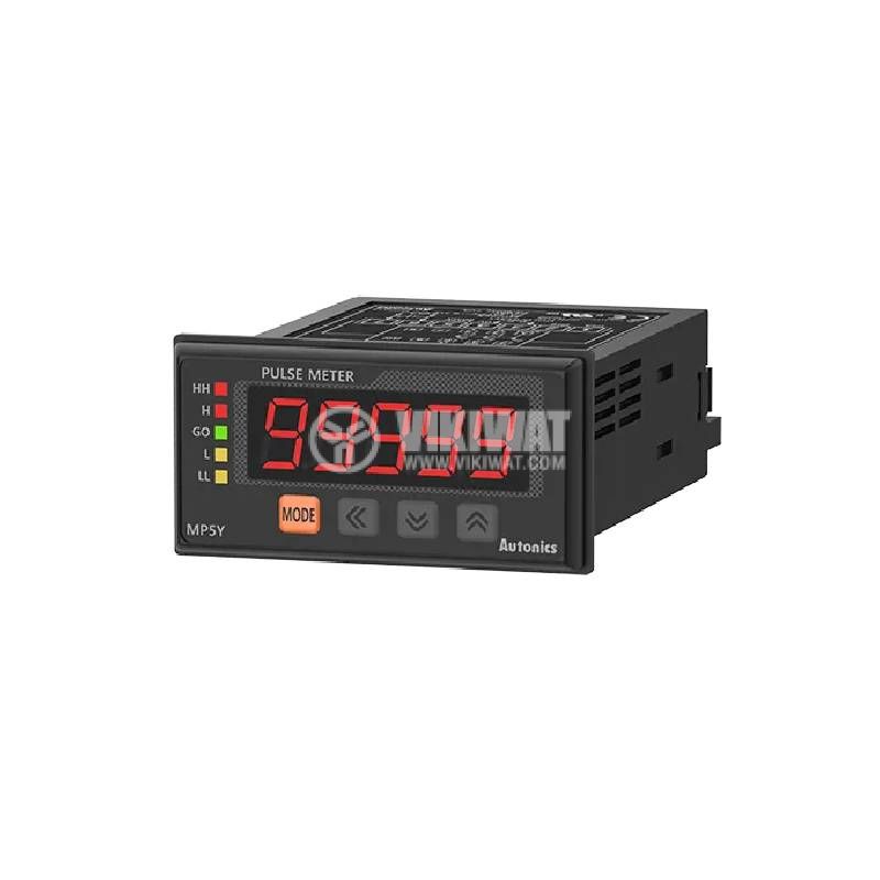 Електронен брояч на импулси/време/скорост MP5Y-41 със захранващо напрежение 100~240 VAC, начин на нулиране електрически, LED дисплей 5 знака, обхват на броене от -19 999 до 99 999 в зависимост от величината.