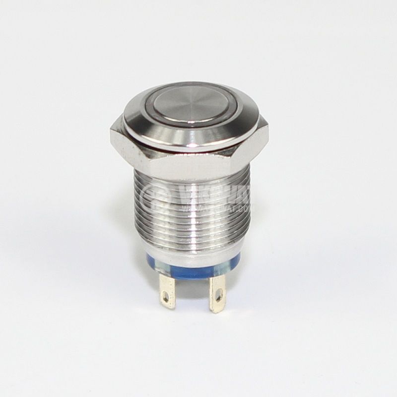 Вандалоустойчив бутон от неръждаема стомана с LED подсветка на 12V, с товароносимост на контактите 3A на 250VAC и конфигурация SPST - незадържащ.