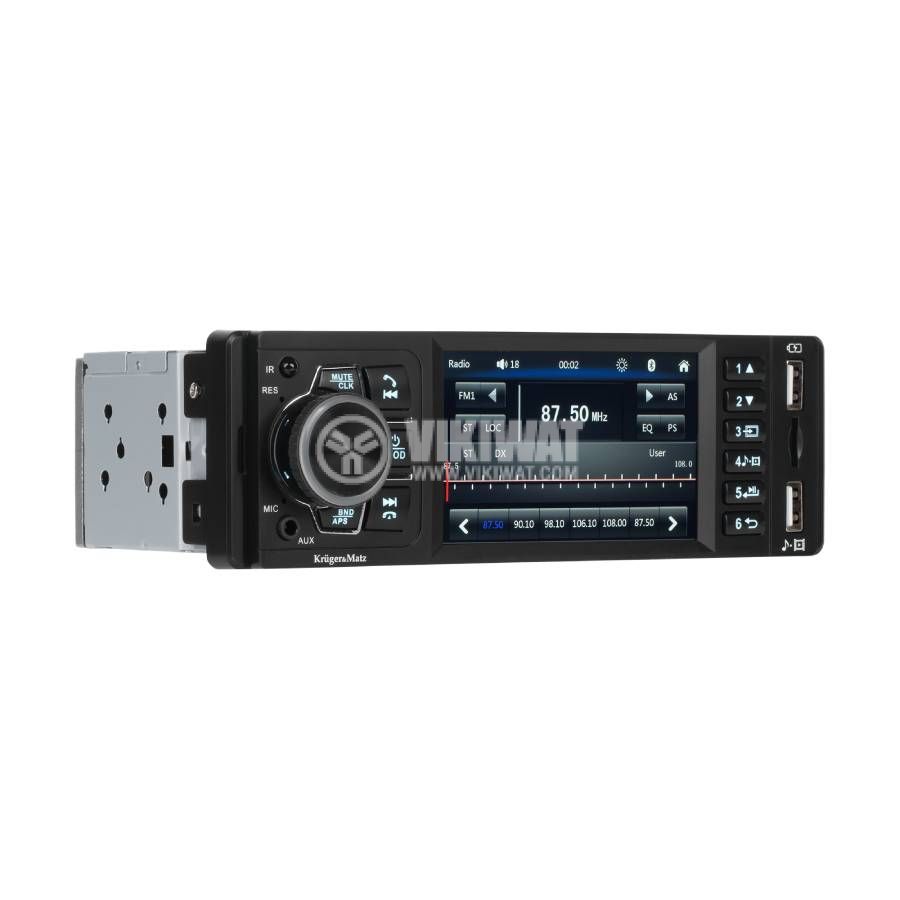 Kruger&Matz car radio with 4 x 50 W power, RDS tuner, Bluetooth, 2xUSB, with remote control and large LCD screen. The radio can play audio and video files and has USB and AUX inputs.