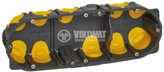 3-gang flush mounting box LEGRAND EcoBatibox 80023L designed for dry partitions (for 3 module German standard or 6/7 modules Italian standard). Mounting depth 40 mm. Drilling diameter 67 mm. Rubber membranes.