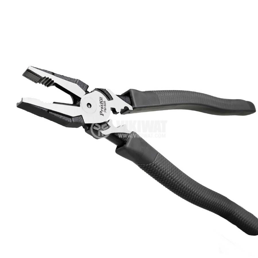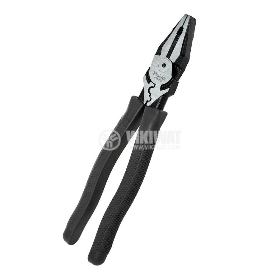 Universal, combination pliers PM-928 from PRO'S KIT with cross cuts for a firm grip, 245mm long. Designed for assembly and repair work in the field of electronics and electrical engineering. Suitable for amateur and professional use.