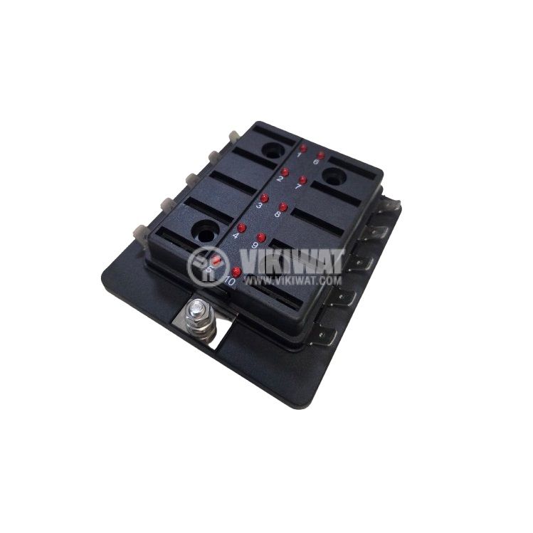 Държачът FB-1711L-N разполага с 10 гнезда за автомобилни предпазители, проектирани до 32VDC системи и допустим ток до 30A на гнездо. Изработен от високоустойчива термопластмаса, той гарантира стабилно закрепване и надеждна работа в натоварени електрически инсталации.