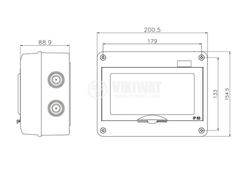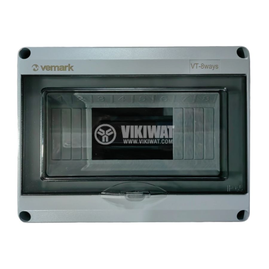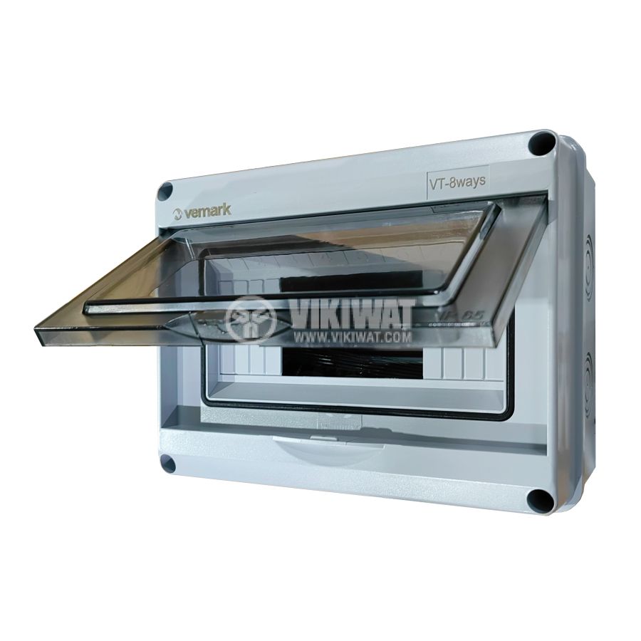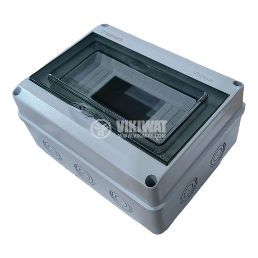 Универсално модулно табло VT-8 от VEMARK, предназначено за външен монтаж - IP65, предназначено за 8 автоматични прекъсвача таблото разполага с прозрачна врата. Бърз и лесен монтаж. Солиден корпус с висок клас на устойчивост срещу удари - IK10. Подходящо за жилищни пространства, соларни инсталации или общо приложение.