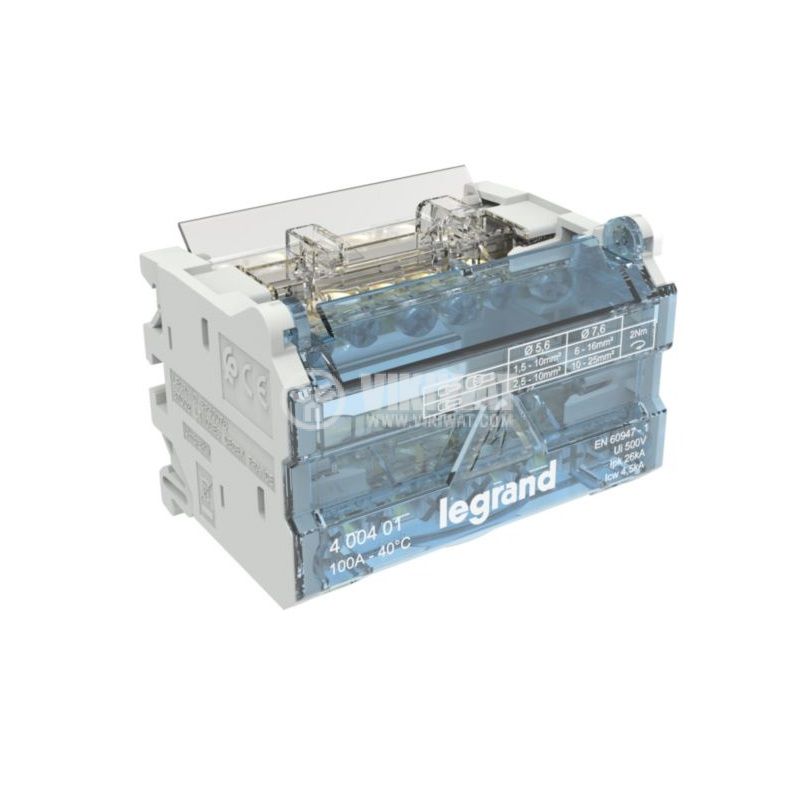 Terminal block 400401 from Legrand, DIN rail mounting with input from 6 to 25 mm² and outputs: 1 pc. from 6 to 25 mm2 and 5 pcs. from 1.5 to 10 mm². With screw terminals and transparent cover.