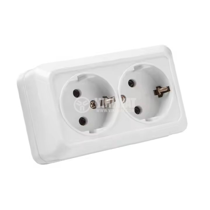 Двоен електрически контакт YW 1812, тип шуко от LEXA, предназначен за повърхностен монтаж, в бял цвят. Подходящ за вътрешно ползване със степен на защита IP20.