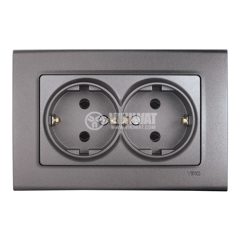 Електрически контакт двоен, в сив цвят, предназначен за вграждане, от серия Linnera life на Viko by Panasonic (90402056-BG). Новият изчистен дизайн в сив цвят е подходящ за жилищни, търговски и офис сгради.