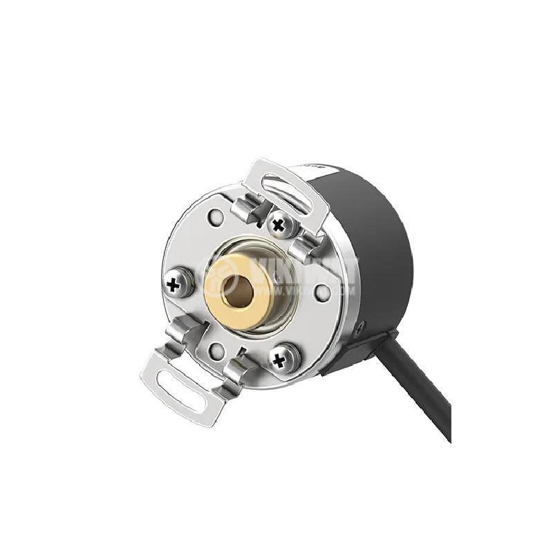 Ротационен енкодер, инкрементален с резолюция 360 импулса за оборот, захранващо напрежение от 12 до 24 VDC и вал ф 8 mm. Дължина на кабела 2 m и степен на защита IP50.