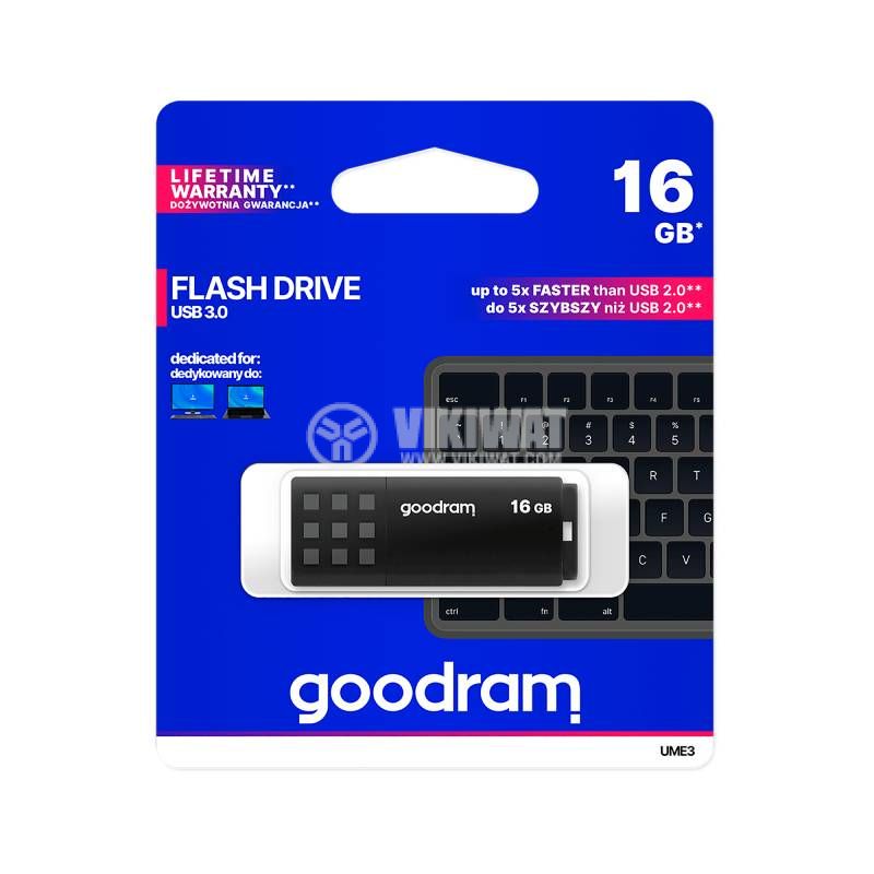 Компактна USB флашка от GOODRAM с капацитет 16 GB, протокол USB3.0, в черен корпус за лесно пренасяне и споделяне на информация.