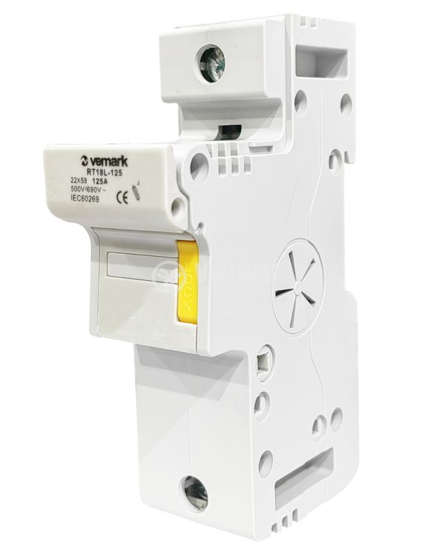 Fuse holder RT18L-125/1P, 1P, with rated current 125A, voltage up to 500 VAC, for fuse with dimensions 22 x 58 mm.