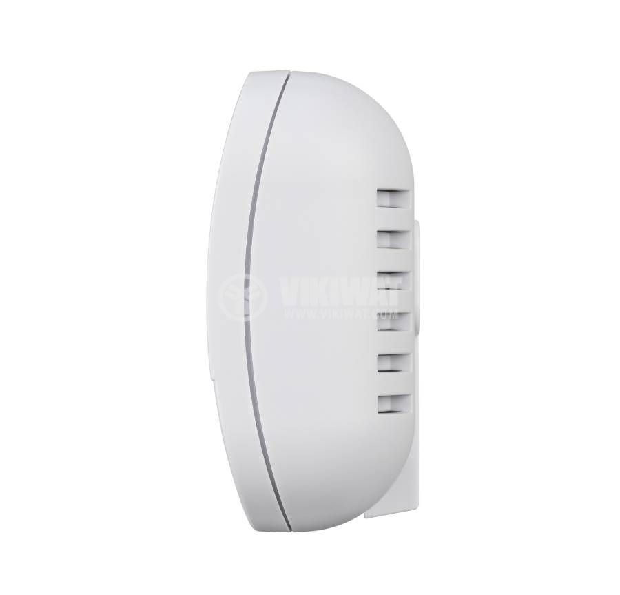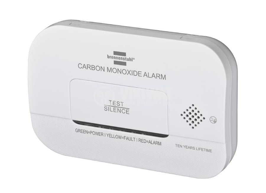 Compact, battery-operated photoelectric carbon monoxide detector (electrochemical CO sensor) from Brennenstuhl, for ceiling mounting with audible alarm, with three-color LED pollution level indication, power supply 2x 1.5 VDC AA batteries and sound level 85dB. Protects against toxic carbon monoxide.