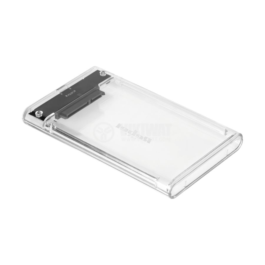 Hard disk (HDD) enclosure with 2.5" SATA size, allowing data transfer via USB-C 3.1 to a laptop or personal computer.