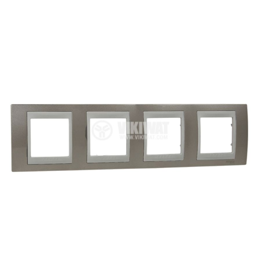 Четворна рамка за ел. ключове и контакти в цвят шампанско/слонова кост за вграждане от серия Unica Plus на Schneider Electric. Може да се комбинира с механизми в различни цветове от същата серия. Изчистен модел, подходящ за модерен интериор. Модел MGU6.008