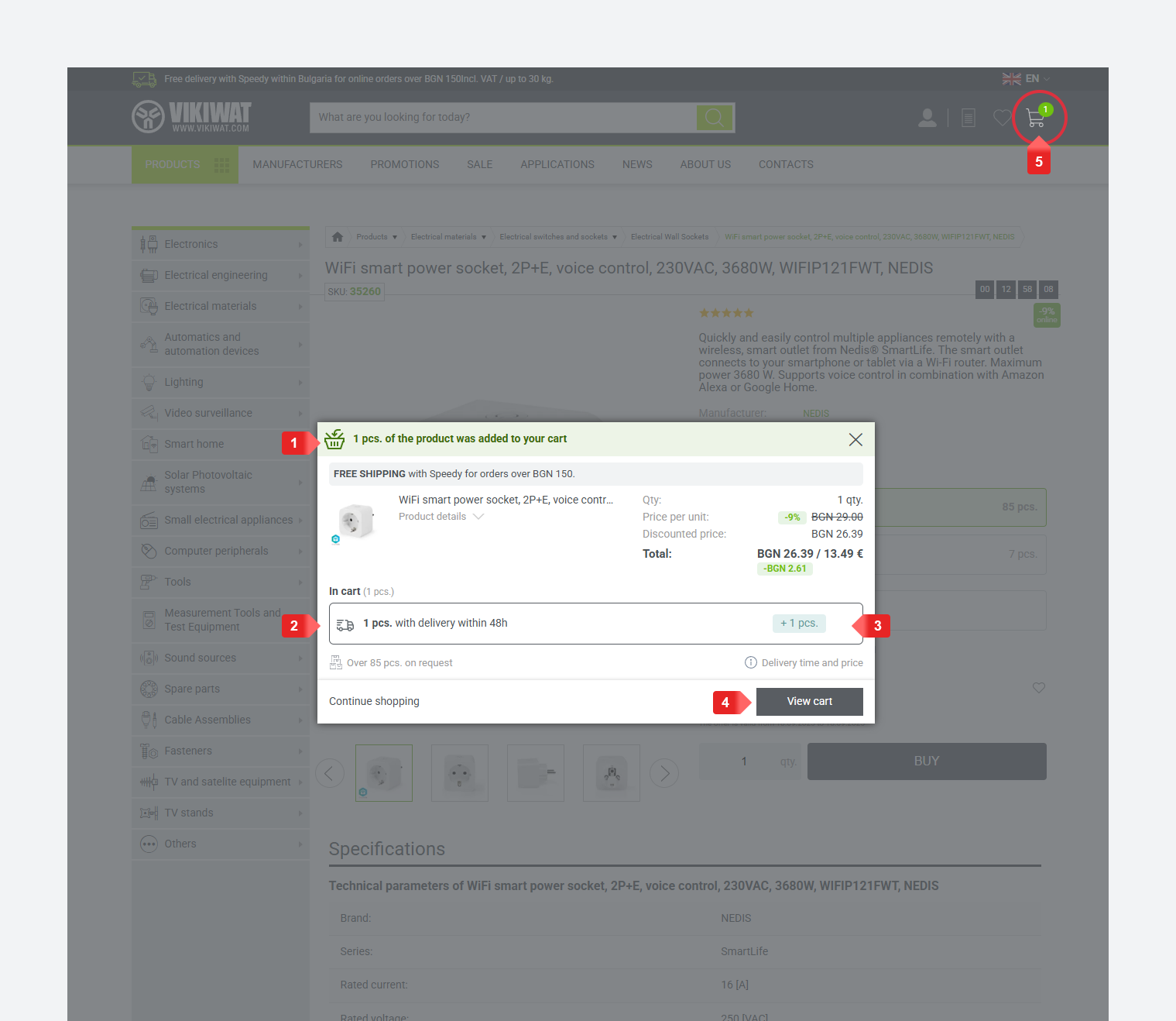 Step 2: After adding a product to the shopping cart, a window with detailed information will open on the screen.