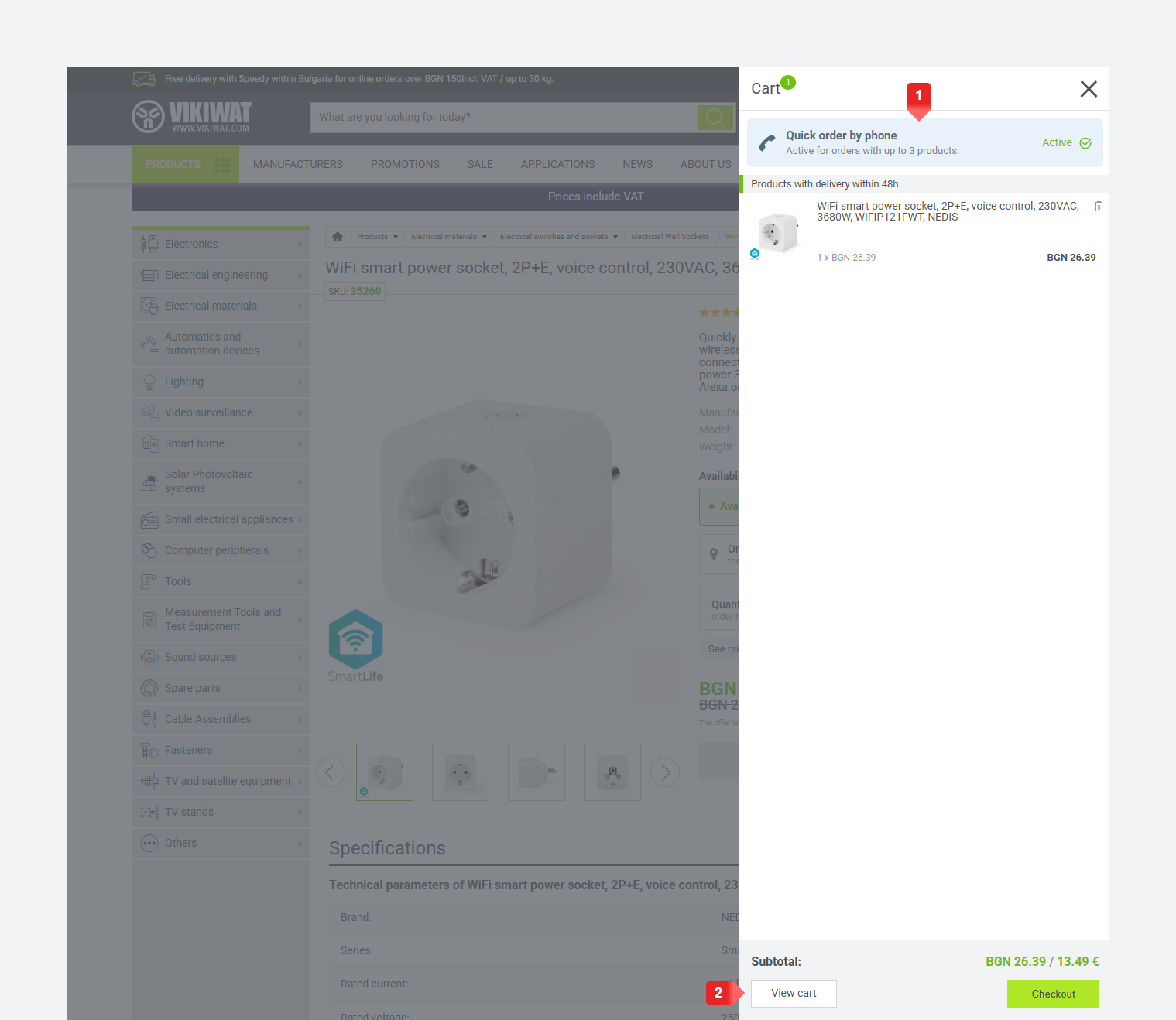 Step 3: When you click on the mini cart (the cart icon showing the number of products added to the cart), a sidebar with the currently added products opens. At the top (1) there is an indicator for an active quick order, i.e. the products in your shopping cart can be purchased via quick order. To place a quick order, go to the cart (2).