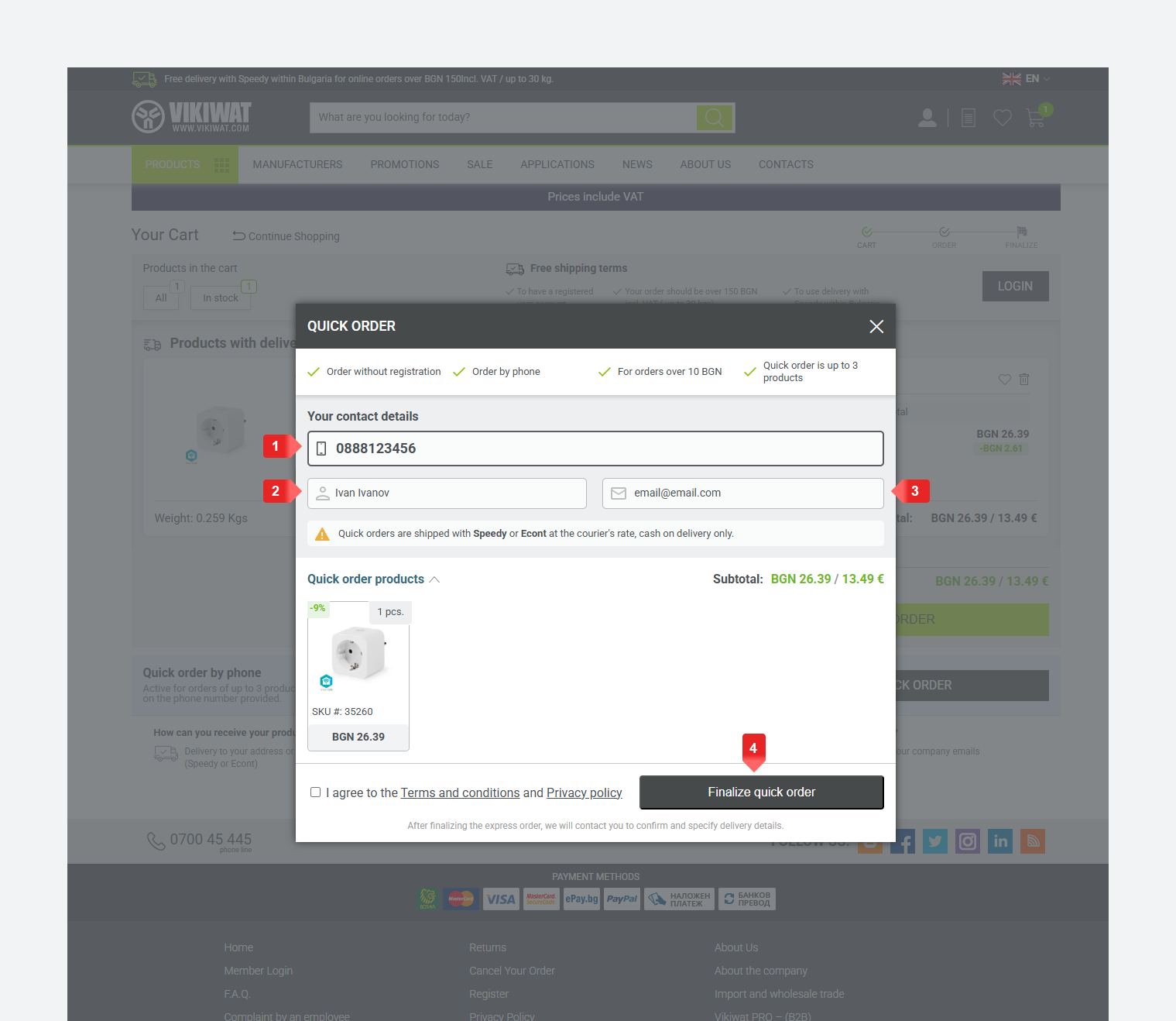 IMPORTANT! The quick order is active for customers without registration on the site. A quick order cannot be placed by customers who are logged into their account.