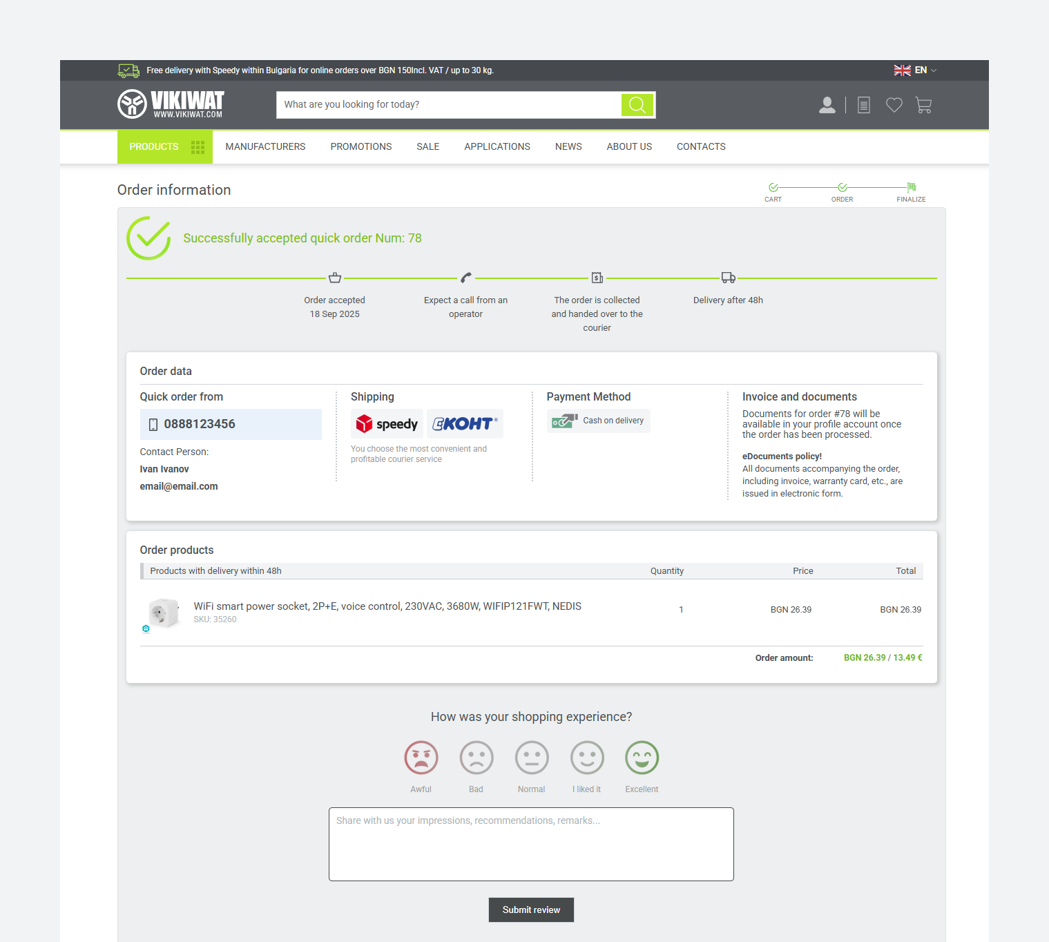 Step 6: In the last step, you will receive confirmation for a successfully completed quick order, as well as all the necessary data and information about your order. We would appreciate it if you leave a review about your experience on our site. Thank you.