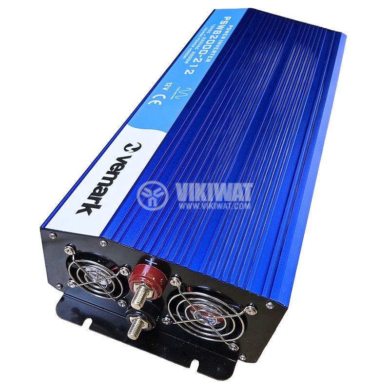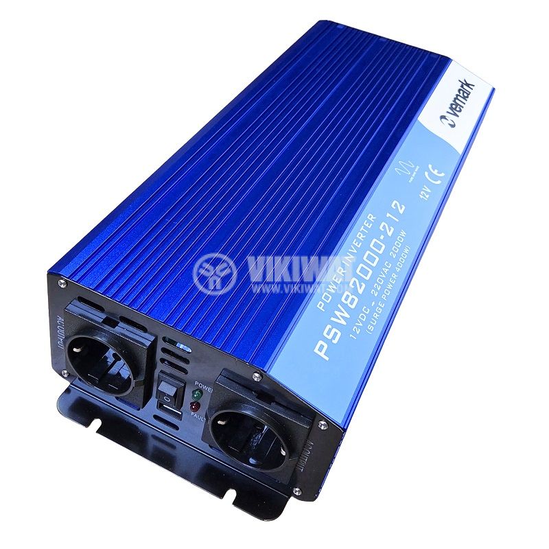 Инверторен преобразувател на напрежение PSW82000 от VEMARK. Устройството преобразува напрежение от 12 VDC към 230 VAC с истинска синусоида и изходна мощност 2000 W (4000 W пикова). Може да се използва в автомобили, камиони, лодки, каравани, кемпери и др.