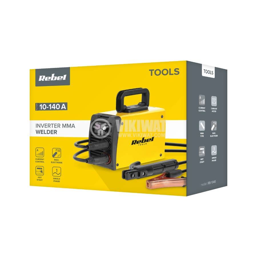 Иверторен електрожен RB-1040 от Rebel със захранващо напрежение 230 V, максимален заваръчен ток 140 A, максимална изходна мощност 4.1 kW.