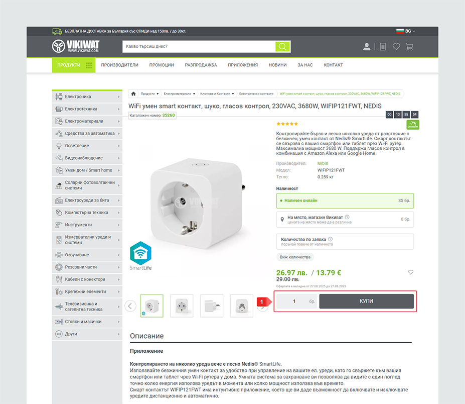 Стъпка 1: В детайлната страница на продукта, който желаете да закупите, въвеждате исканото количество и кликате на бутон "Купи". Продуктът ще се добави в количката Ви, като ще бъдете известени за това с изскачащ прозорец (popup). След това можете да продължите с пазаруването или да пристъпите към поръчка.