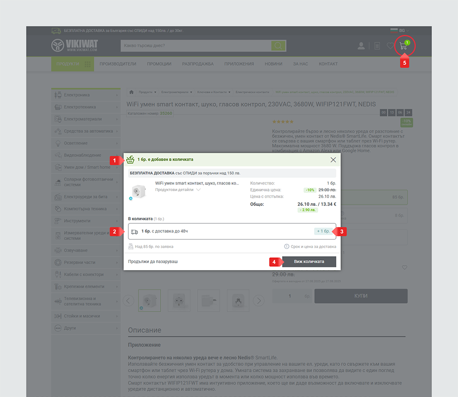 5. В горната част по всяко време може да видите какви продукти сте добавили в количката, без да излизате от текущата страница, в която се намирате.