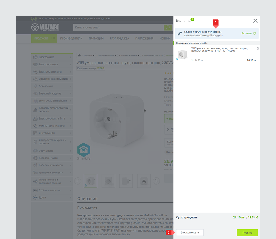 Стъпка 3: При кликване върху мини количката (иконата с количка, показваща броя добавени продукти в количката) се отваря странична лента с текущо добавените продукти в количката Ви. В горната част (1) е наличен индикатор за активна бърза поръчка, т.е. продуктите в количката Ви отговарят на условията да ги закупите чрез бърза поръчка. За да направите бърза поръчка, преминете към количката (2).