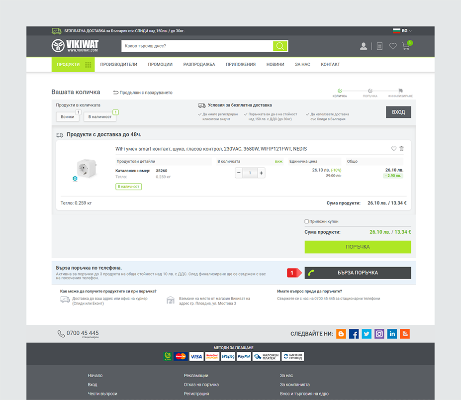 Възможност да закупите до 3 продукта през онлайн магазина без да е неообходимо да имате акаунт и без да се регистрирате. Бързата поръчка е удобен и бърз метод за поръчка. Необходимо е само да предоставите телефонен номер, чрез който наш служител да се свърже с Вас за уточняване на детайлите по доставката на желаните продукти.