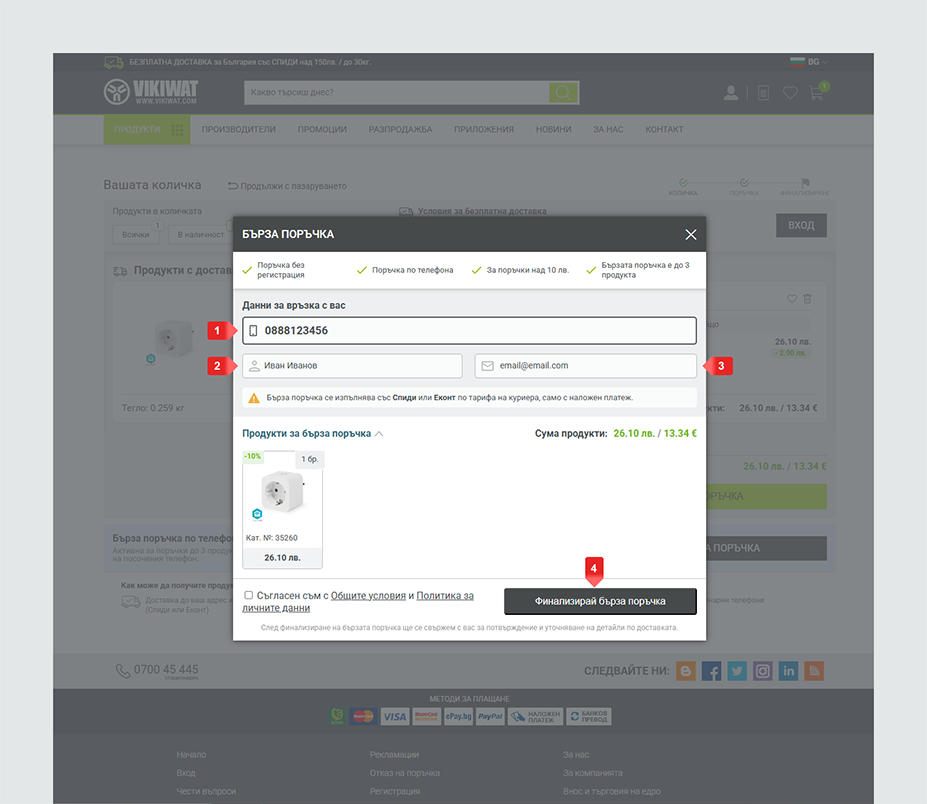 Стъпка 4: За да направите бърза поръчка, кликнете на бутон "Бърза поръчка" в долната част на списъска с добавени продукти за поръчка (количката Ви) (1). Ще се отвори изскачащ прозорец (popup), в който да въведете необходимите данни преди да финализирате поръчката си.
