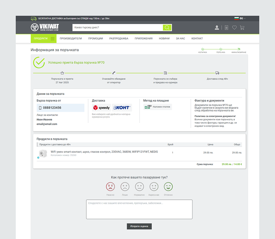 Стъпка 6: На последната стъпка получавате потвърждение за успешно приета бърза поръчка, както и всички необходими данни и информация за поръчката ви. Ще се радваме да оставите отзив за преживяването си в сайта ни, това е важно за нас!