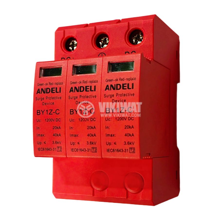Катоден отводител BY1Z-C, наричан още аресторна защита, триполюсен, предназначен за монтаж на DIN шина, номинално напрежение 1200 VDC и максимален ток на разряд 40kA. Подходящ за соларни системи.