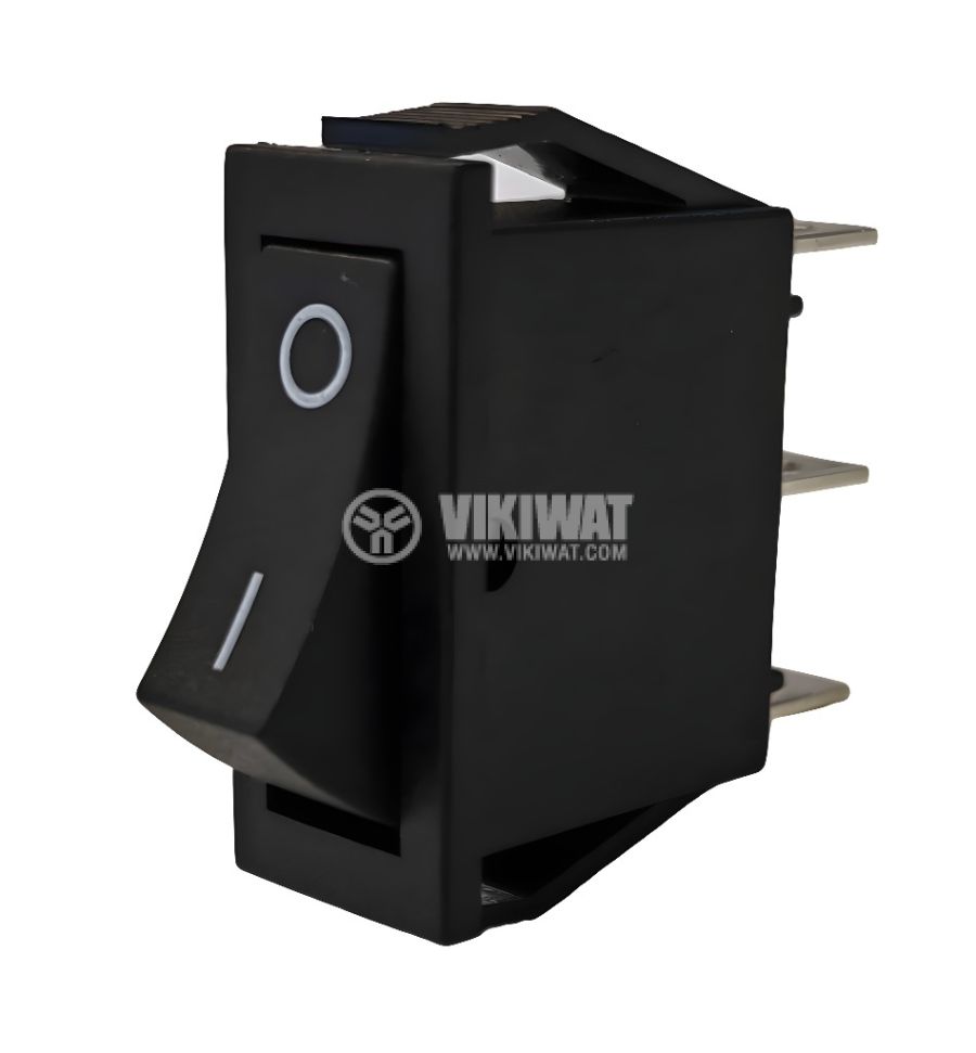 Клавишен превключвател тип (Rocker) KCD3-102, товароспособност 15 A / 250 VAC, превключване ON-ON, контакти SPDT, за монтажен отвор 28x10 mm, 2 стабилни позиции, изводи 3 пина.