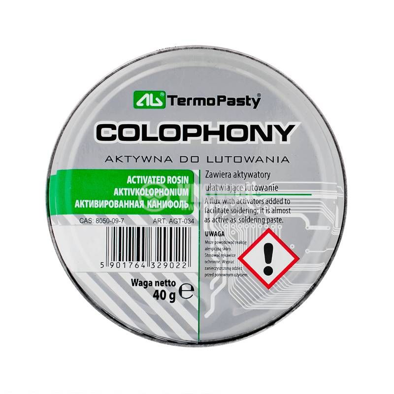 Колофон в разфасовка от 40 g (пластмасова кутийка). Колофонът е в твърдо състояние.