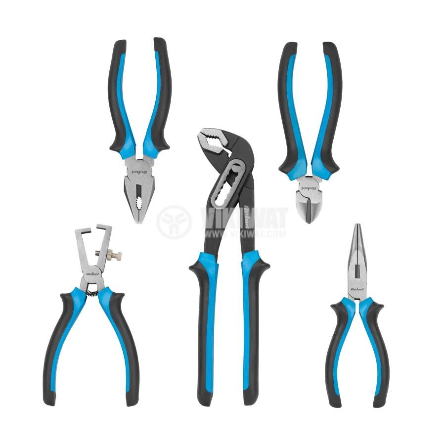 Професионален комплект от Rebel с 5 броя клещи от високачествена стомана. Комплектът съдържа универсални, резачки, гарги, издължени клещи, както и за оголване на каблни проводници.