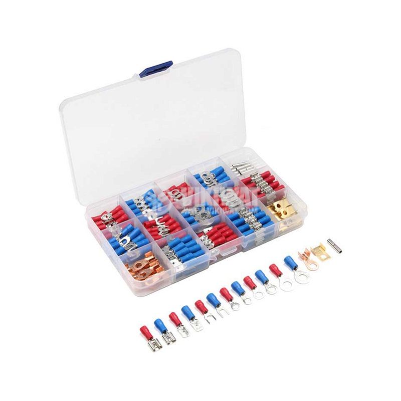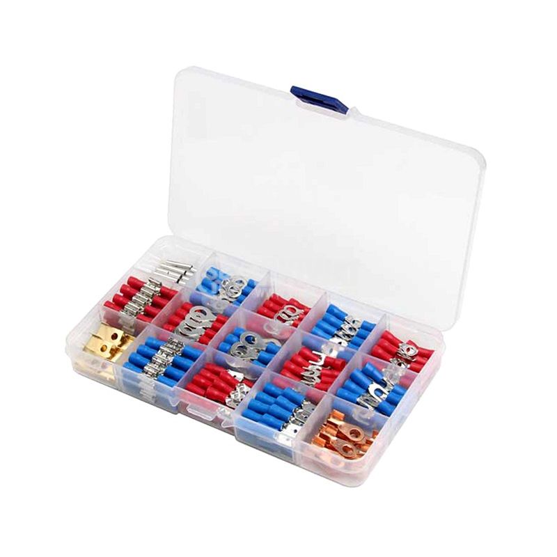 Комплект от различни кабелни накрайници в син и червен цвят. Кутията съдържа 300 накрайника в 15 различни вида, които позволяват визуална проверка, предотвратява корозия и осигуряване на водоустойчиво уплътнение.